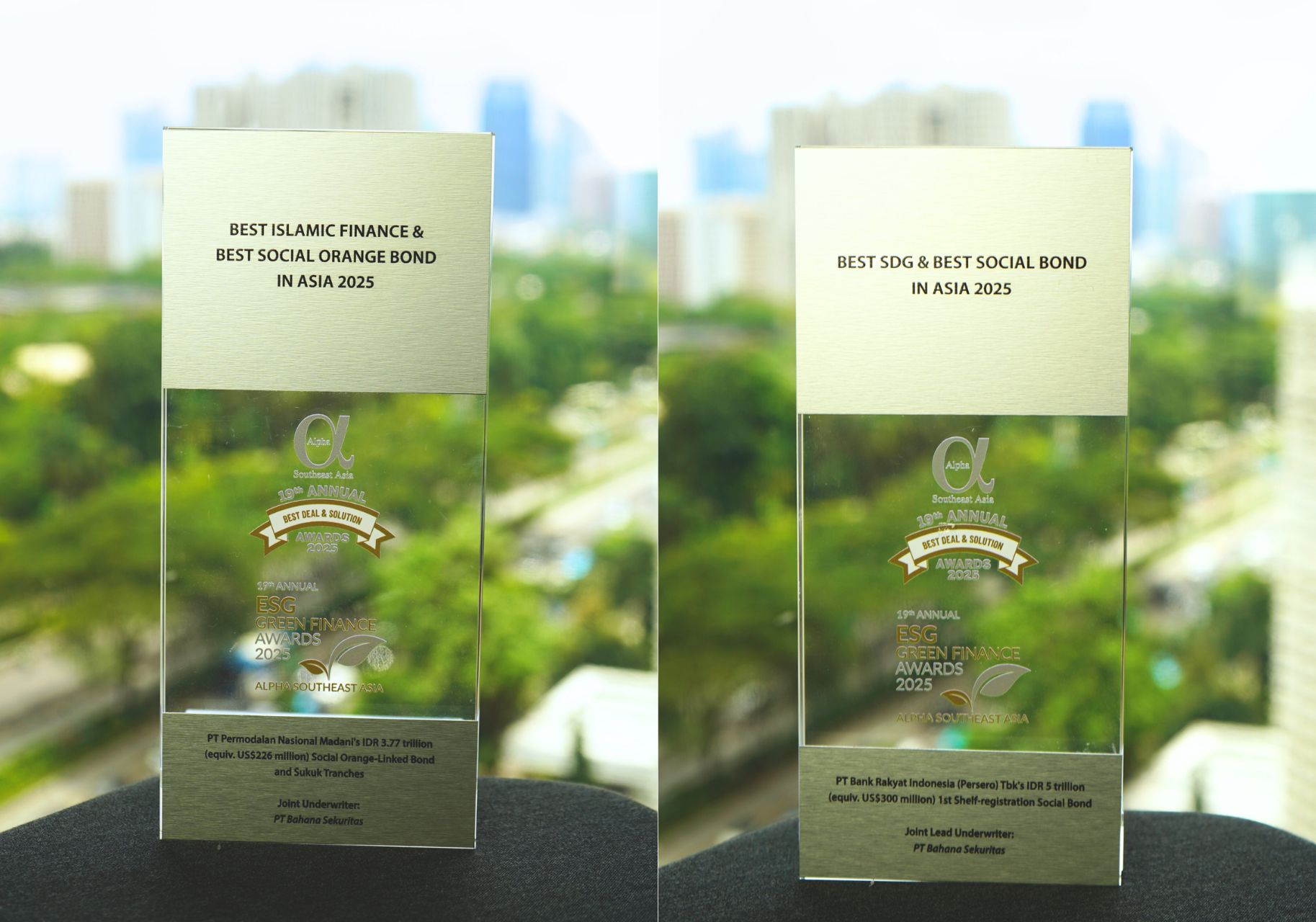 Pada kategori pertama, PT Bahana Sekuritas dianugerahi Best SDG & Best Social Bond in Asia 2025 atas keberhasilannya sebagai Joint Lead Underwriter dalam transaksi penerbitan PT Bank Rakyat Indonesia (Persero) Tbk’s IDR 5 triliun (setara US$300 juta) 1st Shelf Registration Social Bond. Transaksi ini merupakan salah satu penerbitan obligasi sosial terbesar di kawasan Asia, yang bertujuan mendukung pembiayaan berkelanjutan, khususnya pada sektor-sektor yang memberikan dampak sosial positif, termasuk pemberdayaan UMKM, pembiayaan inklusif, serta penguatan ekonomi masyarakat.
